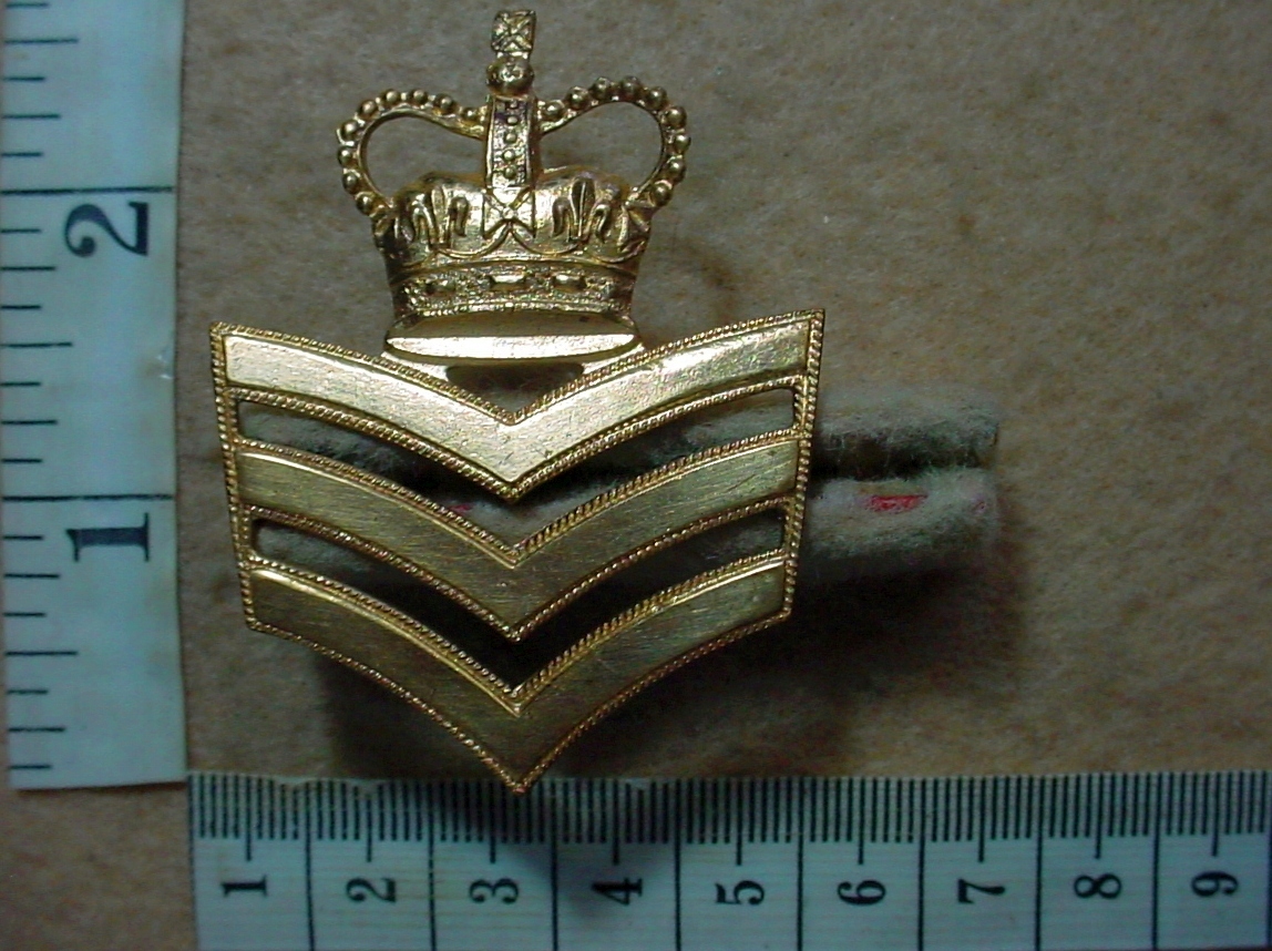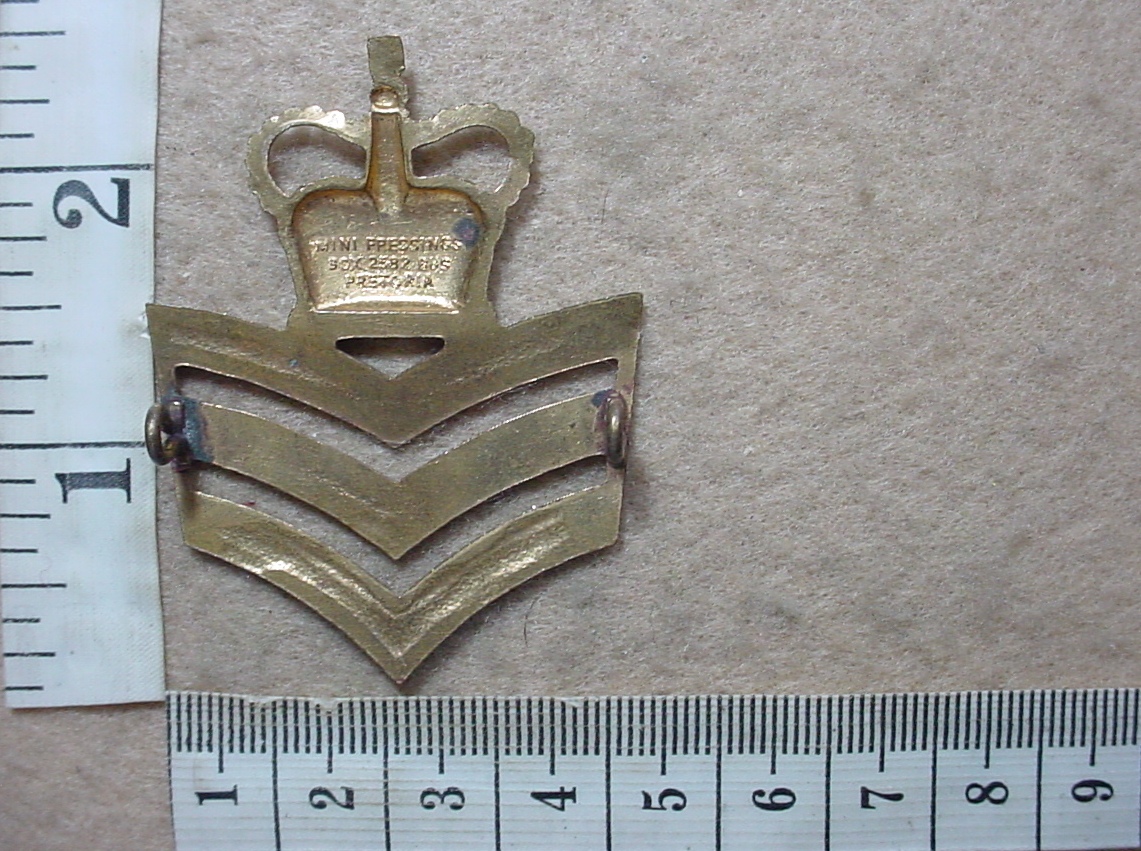 Rhodesia British South Africa Police First Sergeant rank badge, Queen’s Crown, hallmarked MINI PRESSINGS BOX 2582 PRETORIA, made in South Africa for Rhodesia, Summer Dress (Rhodesian Police)