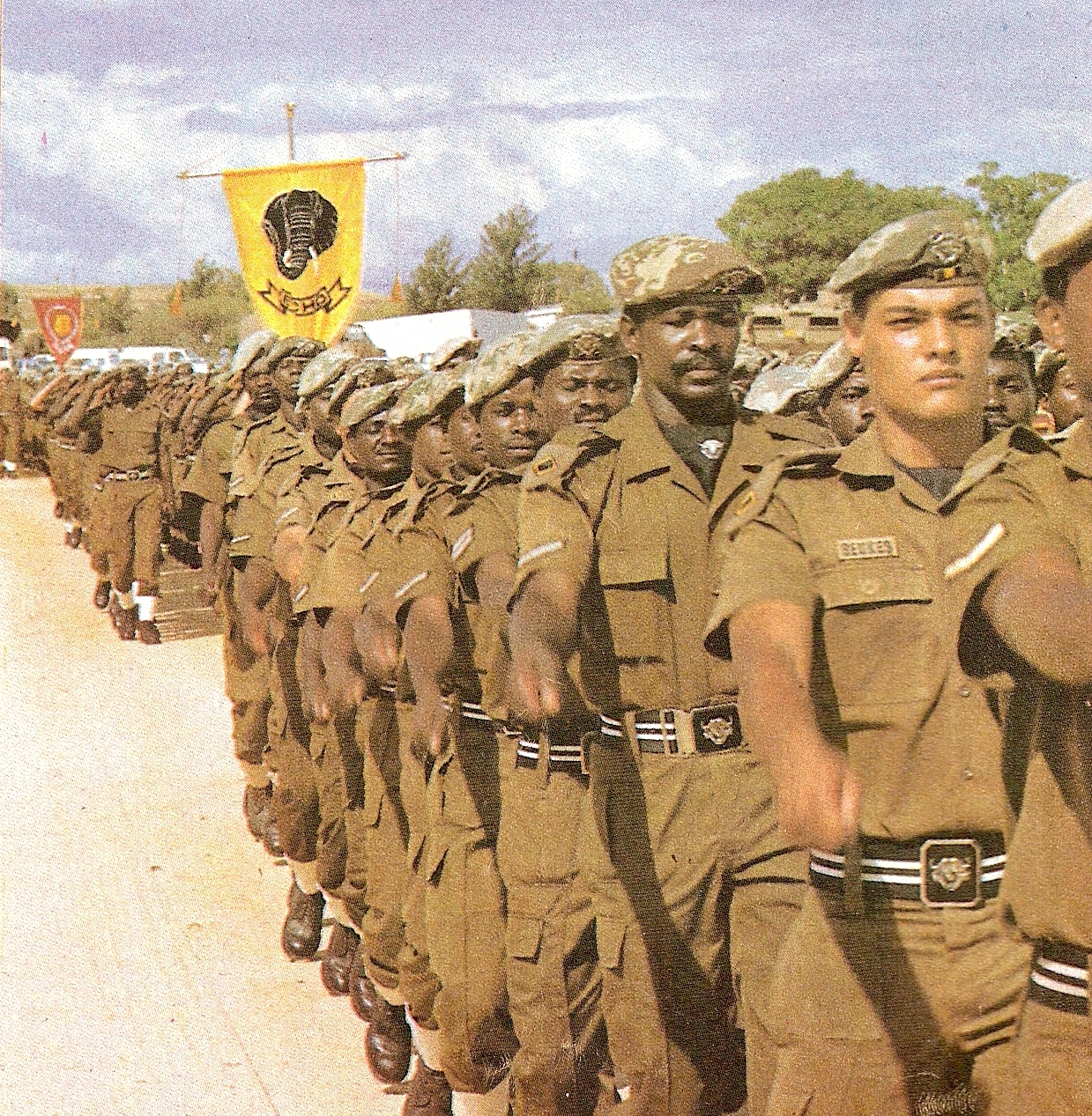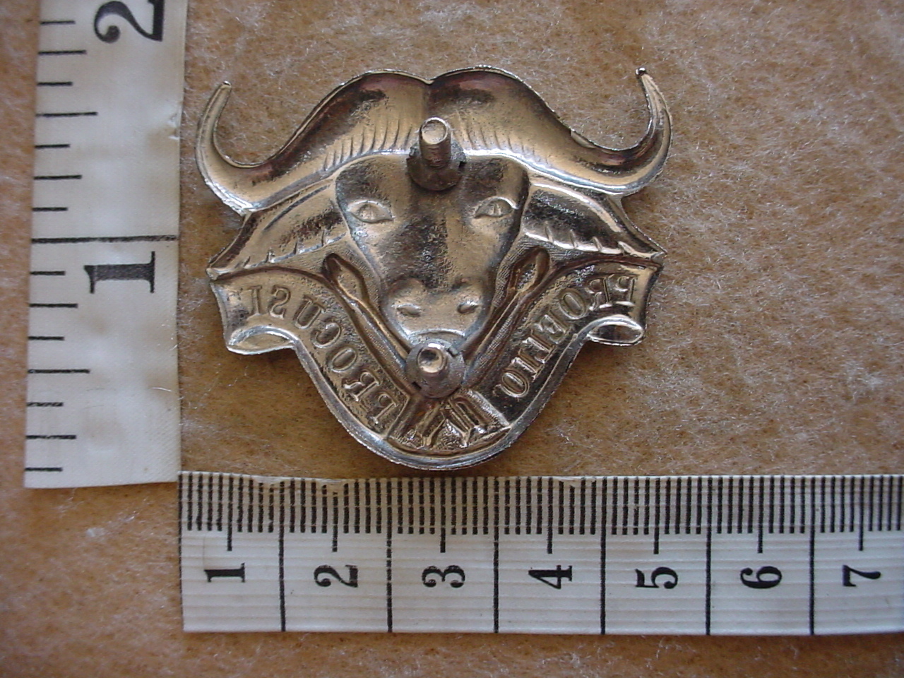32 Battalion beret badge, original issue, also used on the stable belt buckle. A note to collectors, there was never a brass 32 Bn beret badge or collar badges made or worn at any stage, all were chromed. Be aware of the sellers on internet auctions selling the brass badges as “Rare 1st issue”, these, and most of the chromed ones being sold are newly made fakes. The brass badges in Colin Owen’s book, The Military Badges and Insignia of Southern Africa, came out the factory incomplete, had not been chromed yet, and were incorrectly identified as 1st issue.
