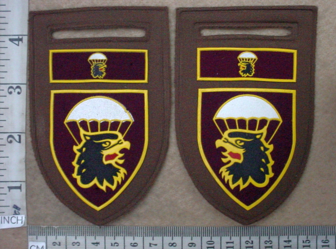 South African 44 Parachute Regiment arm flashes, 44 Para Regt balkies, facing pair, scarce, small spots of Prestik on one flash, otherwise near mint condition. Note, this arm flash design was worn from 1983, but the balkie above it was only worn from 1999 when 44 Para Bde was changed to 44 Para Regt.
