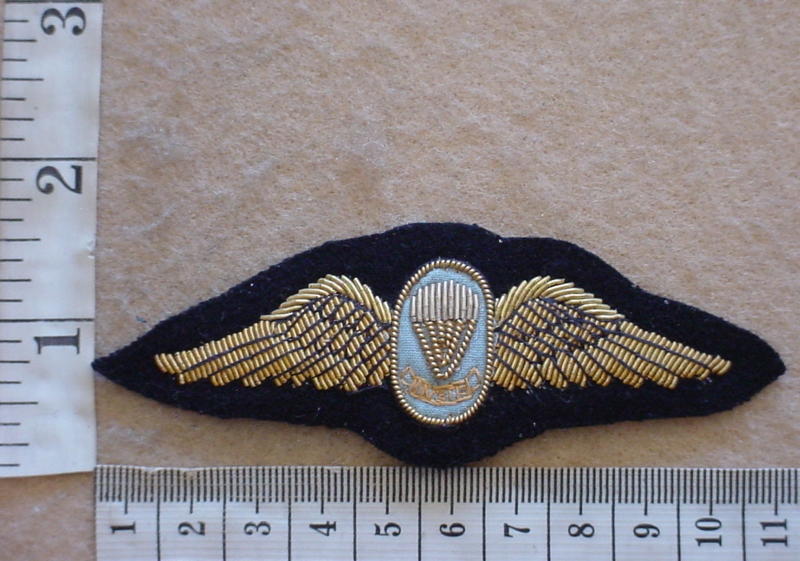 South African Navy Parachute Instructor wings, Winter Dress, private purchase. The navy did not have a parachute unit, but there were ex-Army paratroopers who transferred to the navy and also some of the SA Navy Divers did parachute courses. The first Officer Commanding the SA Marines was an ex-1 Parachute Battalion PJI. These wings were not supplied by the stores, each qualified paratrooper had to order the wings from a military tailor so many slight variations exist.
