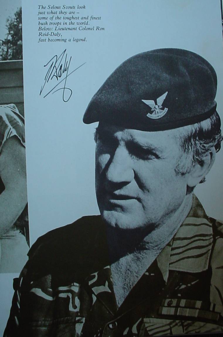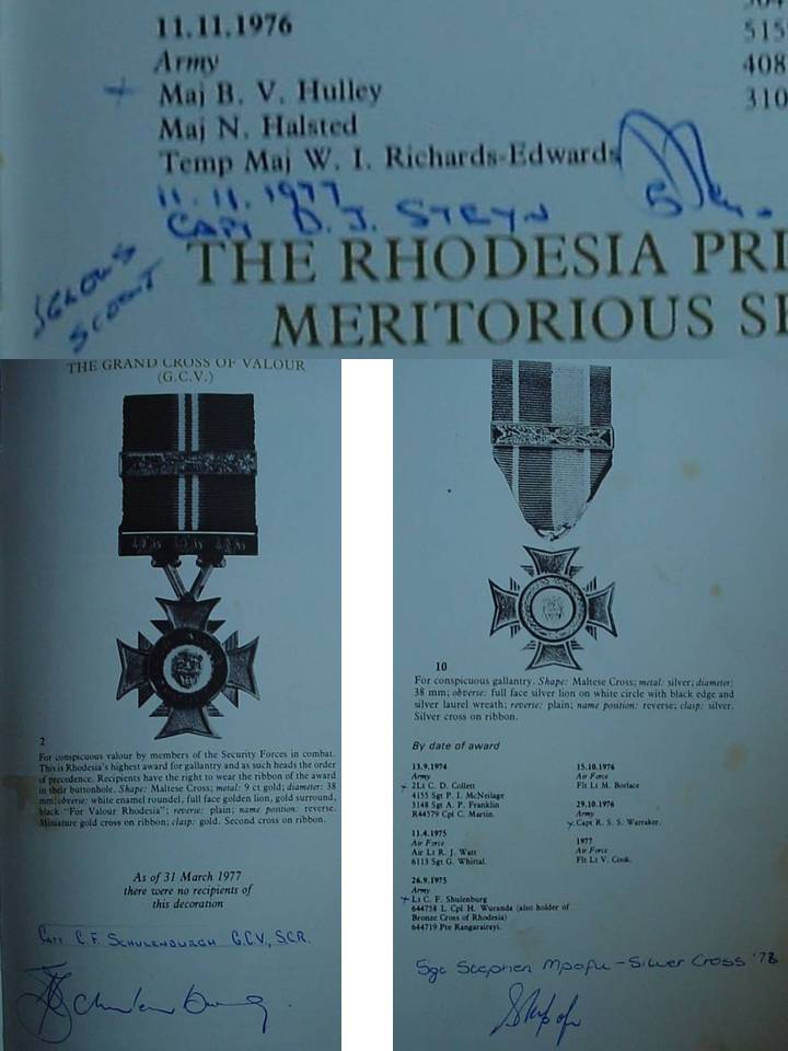 Signed by Lieut Colonel Ron Reid Daly CLM DMM MBE – first Commanding Officer of the Selous Scouts, Captain Daniel Steyn DMM, Captain Chris Schulenburgh GCV SCR, Sergeant Stephen Mpofu SCR, and Lieutenant Chris Gough OLM, all Selous Scouts.